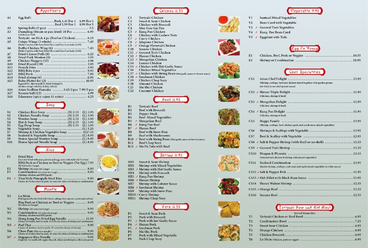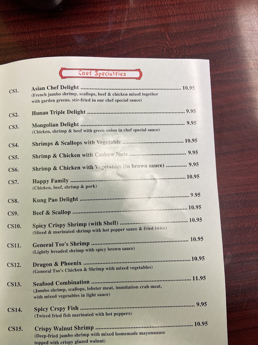 Asian Chef also features chef specialties like the Hunan Triple Delight (CS2) and the Mongolian Delight (CS3), which provide an exciting fusion of flavors. For a unique twist, try the New York Style Chow Mein, which adds a different flair to traditional Asian noodles.