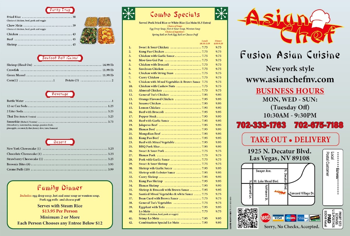 Whether you're stopping by for a quick lunch with the Lunch Combo Special or hosting a party with a Party Tray of fried rice, chow mein, and more, Asian Chef offers an extensive menu that’s perfect for all occasions and tastes. The variety and quality make it a standout choice in Las Vegas.